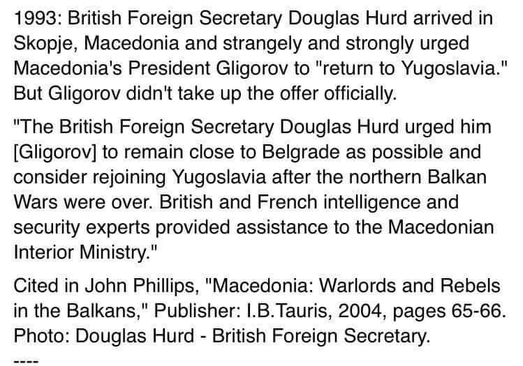 In 1993, British Foreign Minister (Foreign Secretary) Douglas Hurd, whilst on a visit to Skopje, proposed to Gligorov that Macedonia should “return” to Serb Yugoslavist rule once the wars were over, meaning once Milosevic had quickly wrapped up his objectives, which never came to pass.