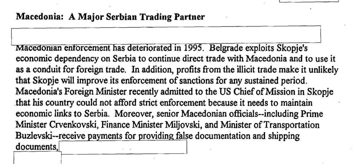 1. Ljubomir Frckoski – the controversial politician, “public intellectual,” was Macedonia’s Interior Minister during the Gligorov assassination attempt. His portfolio included the Police, Border Control and Intelligence Services. He was a senior member of the then SDSM (Social Democrats) government of Macedonia led by Prime Minister Branko Crvenkovski. A government that was one of the most corrupt in recent Macedonian history, heavily involved in illegal smuggling in breaking United Nations sanctions imposed upon the Slobodan Milosevic regime in Serbia. That corruption reached the very top, the Prime Minister Crvekovski himself, as this declassified 1995 CIA report shows: