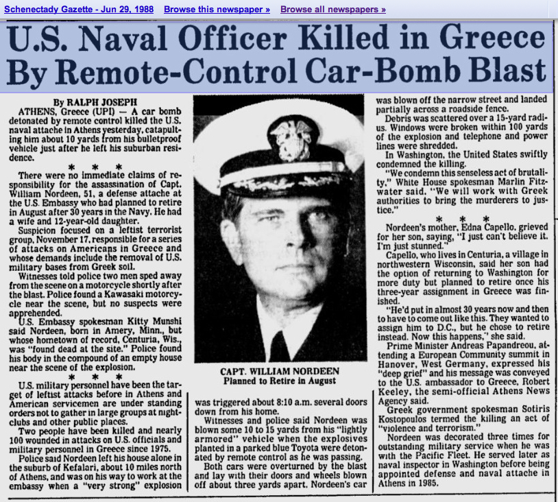 The 1988 assassination of US Naval Attaché, Captain William Nordeen, by Greek terrorist group 17 November resembles the attempted Gligorov hit in 1995 almost down to the finest details, such as Gligorov’s route by car, timings, etc.