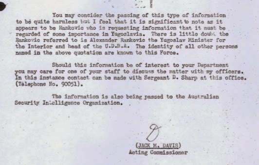 1986 ASIO report: quote: “We now have the extraordinary situation of the AFP doing owner-occupier checks for YIS [Yugoslav Intelligence Service, UDBa/SDB] officers enabling them to carry out intelligence gathering interviews in Aust. [Australia].”