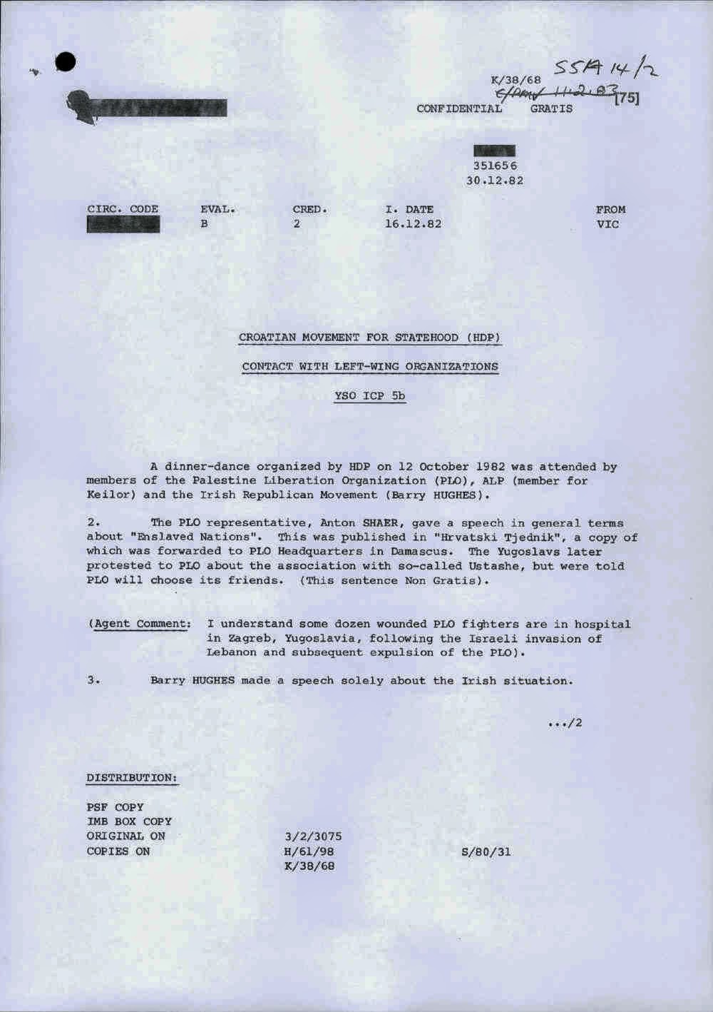 In 1982, the HDP organised a dinner-dance in Melbourne, Australia and invited a representative from the Palestinian Liberation Organisation (PLO), Anton Shaer, and the Irish Republican Movement, Barry Hughes to give a talk. Also present was the ALP MP for the state seat of Keilor, Australian-Croat, George Seitz.