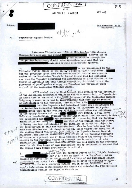 The ASIO report also details Yugoslav government intimidation of the Sveti Georgi (Saint George) Macedonian Orthodox Church in Fitzroy, Melbourne.