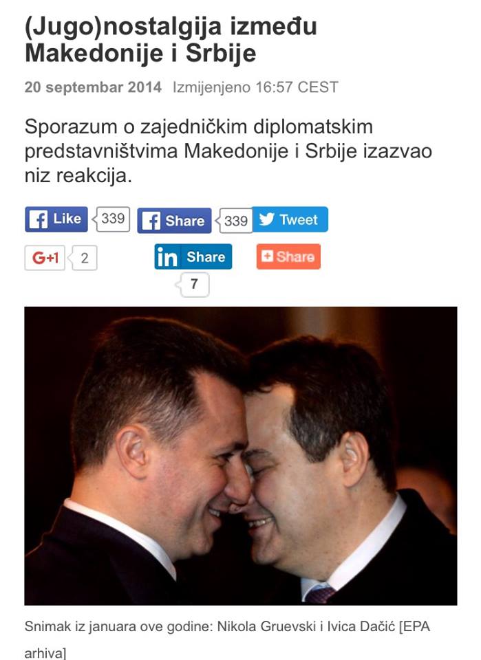 Gruevski and Dacic get up close and personal. Absolutely no protests in the streets in Skopje from anyone, nationalist or internationalist, during the joint Serb-Macedonian Embassy deal. How odd?