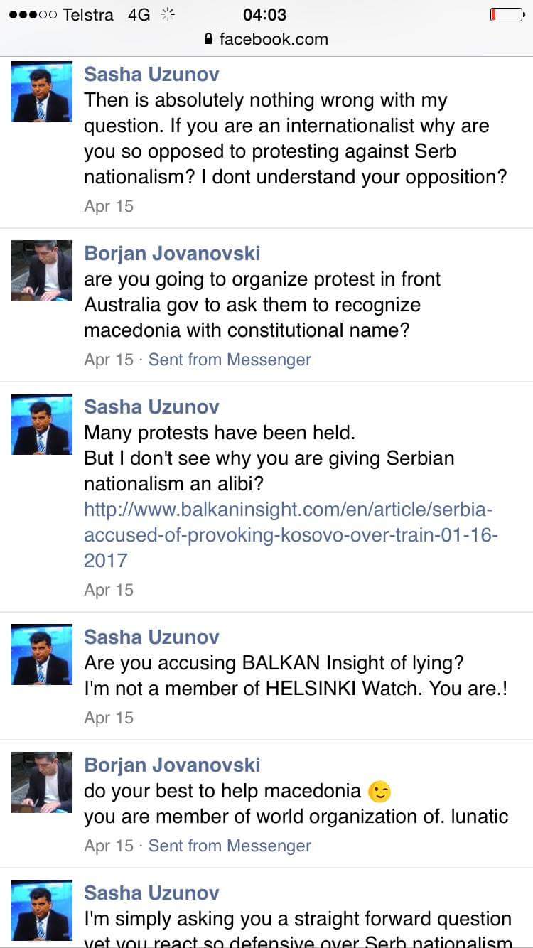 Jovanovski portrays himself in the media as an “anti nationalist” and Albanian “rights” activist. So his reaction, his stubborn refusal to protest outside the Serbian Embassy in Skopje, puts him at odds with this public image that he cultivates as well the story he is now peddling. Again we ask, if he is an internationalist why is Serbian nationalism and Serbian cultural hegemony such a very very sensitive subject? Young people in Macedonia can openly discuss drug addiction, political corruption, gender and gay rights issues but Serbian cultural hegemony remains a taboo. Very odd indeed !