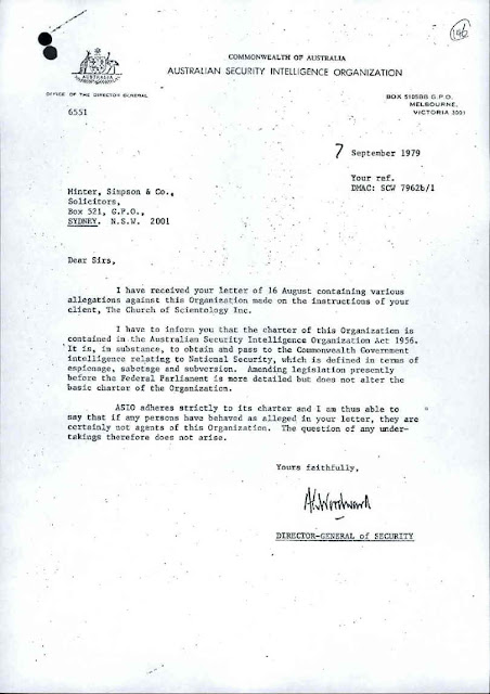 The Church of Scientology engaged an Australian law form, Minter, Simpson & Co, which sent a letter to our domestic spooks, and also warned them not to share any information with the United States of America’s external spy service, the Central Intelligence Agency (CIA).
