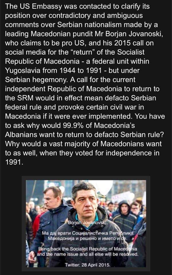 6. Doesn’t it strike you as odd that the people who are claiming that there is Serbian-Russian intelligence collusion in Macedonia, such as leading pundit Borjan Jovanovski, steadfastly, stubbornly and aggressively refuse to protest against Serb nationalism and intelligence “interference” in Macedonia outside the Serbian Embassy in Skopje, and even go to the extreme of calling for Macedonia to give up its independence and return to defacto Serb-Yugoslavist tule? see link here