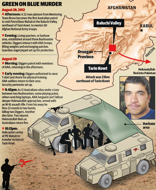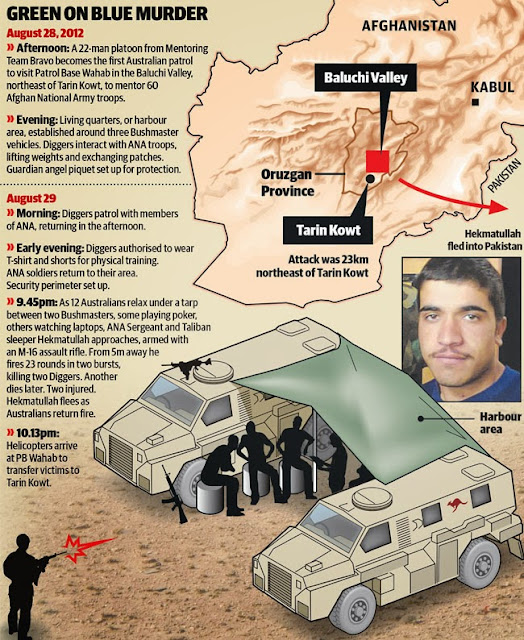The story in the Herald Sun newspaper (see below) raises the ugly possibility that it was Australian Army Officer incompetence that contributed to the deaths of 3 diggers (soldiers) in a green on blue incident, that is Afghan soldiers who are Taliban sleeper operatives attacking Western soldiers.