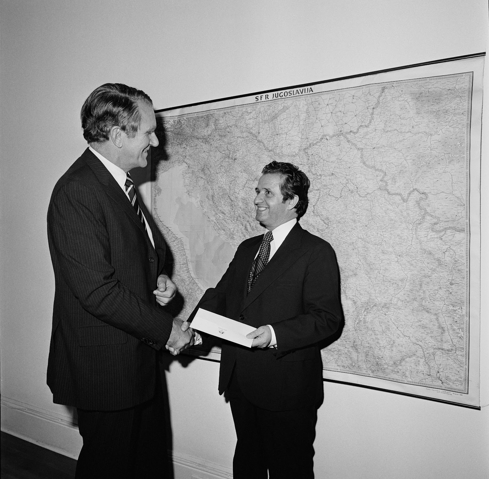In both photos, taken in 1979, Trajkovski meets an unsuspecting Australian Prime Minister Malcolm Fraser (1975-83), after the Prime Minister donated a cheque for earthquake victims in then Yugoslavia.