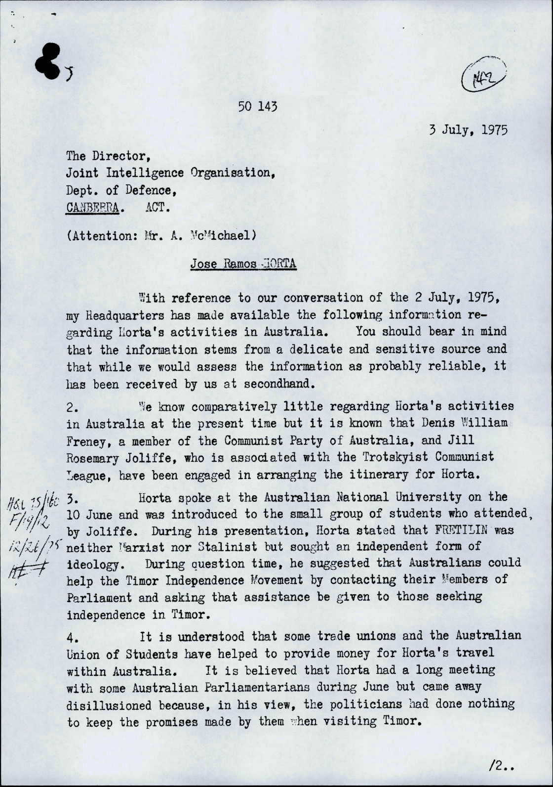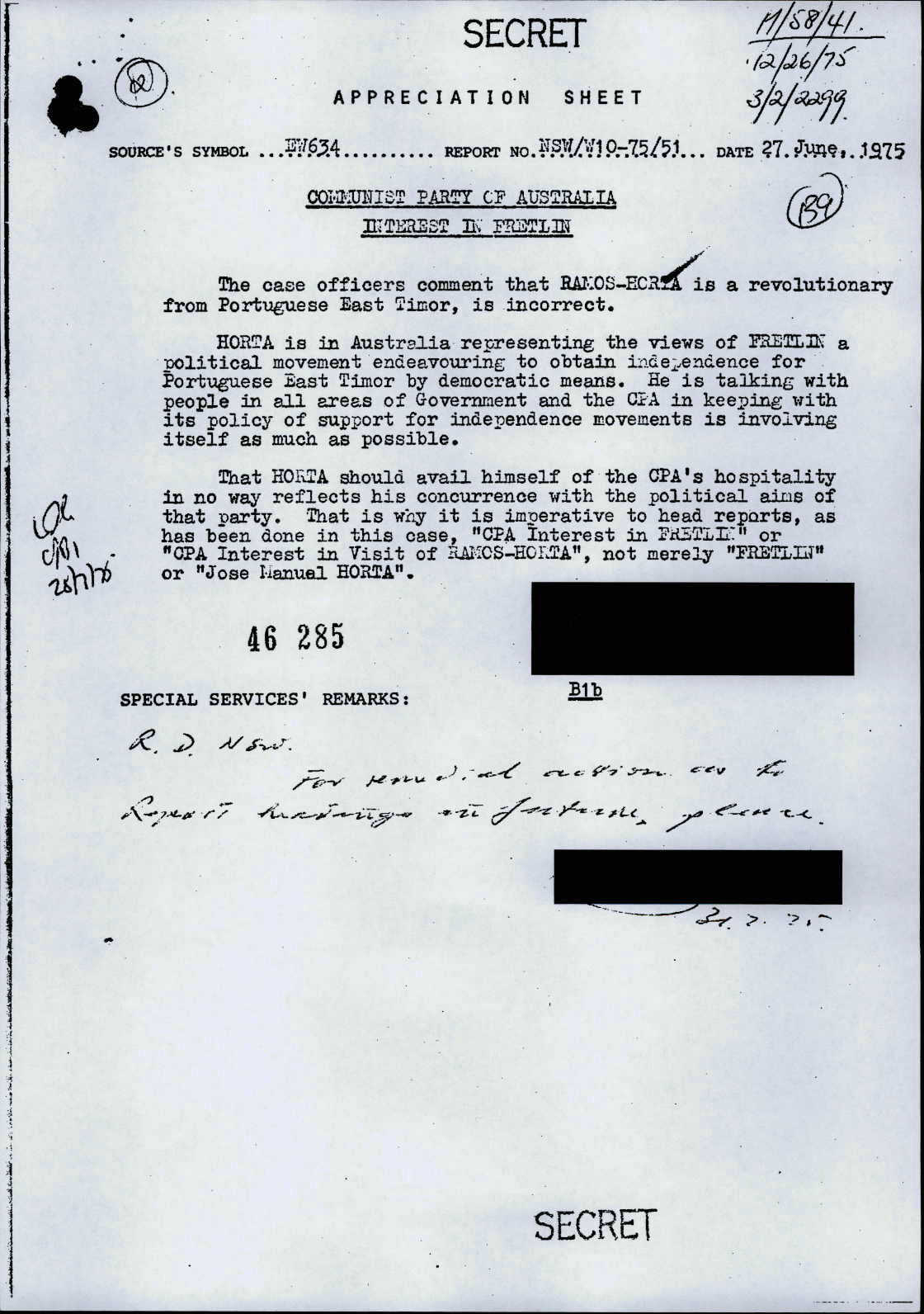 A June 27, 1975 ASIO report- HORTA IS IN AUSTRALIA REPRESENTING THE VIEWS OF FRETILIN A POLITICAL MOVEMENT ENDEAVOURING TO OBTAIN INDEPENDENCE FOR PORTUGUESE TIMOR BY DEMOCRATIC MEANS. HE IS TALKING WITH PEOPLE IN ALL AREAS OF GOVERNMENT…