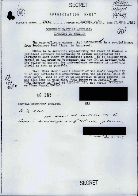 The ASIO files state clearly that RAMOS HORTA made it obvious that FRETILIN was neither Marxist or Stalinist. ASIO analysts saw the light on this. You can see the change in assessments. Instead, ASIO, some would say in a rather paranoid manner, placed undue emphasis on the prominent Australian left wingers who showed an interest in East Timor. There are thousands upon thousands of pages on prominent Australian journalist Jill Joliffe and Denis Freney who gave their support for Timorese independence.
