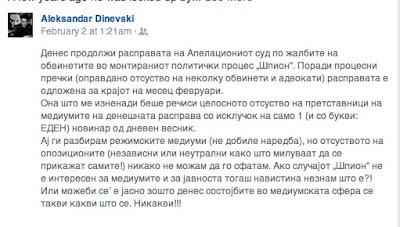 UPDATE – 2 February 2016 – Dinevski has lodged an appeal with Macedonia’s Court of Appeals to have his conviction overturned. It has been deferred til the end of February 2016. This post from Dinevski in Macedonian on Facebook, revealing that both pro-government and opposition media stayed away from the initial court hearing, with only one journalist turning up.