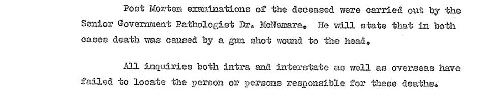 “But to help you out I am authorised tell you that both men were killed at close range by a small calibre firearm. I have also been authorised to give you this extract from the Coroners Summary if it helps.”
