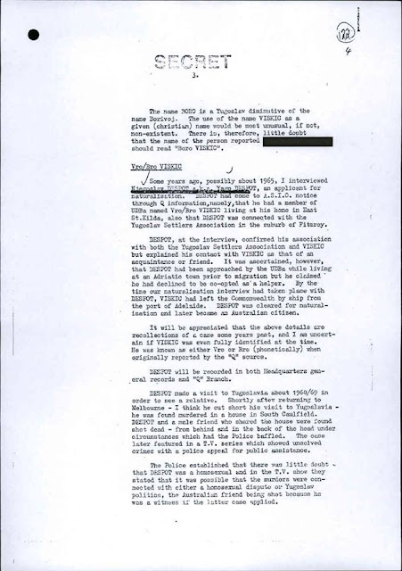 By the sounds of it, Despot feared for his life. And having had an earlier friendship with a suspected UDBa officer, Viskovic, had to be silenced before he was able to reveal more. This remains speculation but the ASIO report (see below) from 1972 has outlined a strong circumstantial case, three years after the double murder.
