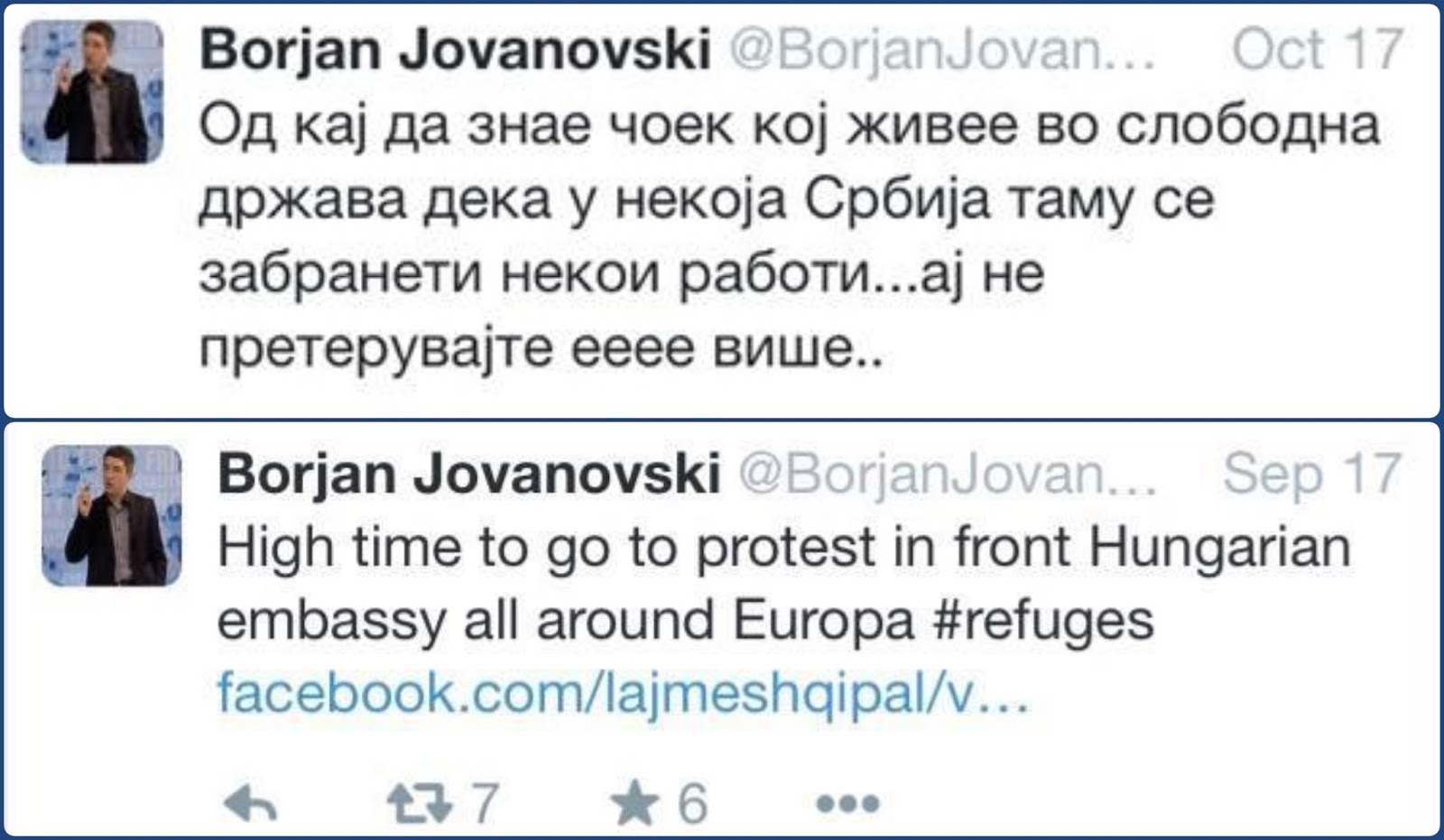 Twitter: Mr Borjan Jovanovski, a former Macedonian Presidential advisor, in a note deliberately written in Macedonian with some Serbian words thrown in, cheekily says: “concerns about certain things in Serbia being banned, hey stop exaggerating.” However, in an English note, he calls for protests against Hungary. In the meantime, Mr Jovanovski has not called for any protests against Serbia or rising Serbian nationalism.