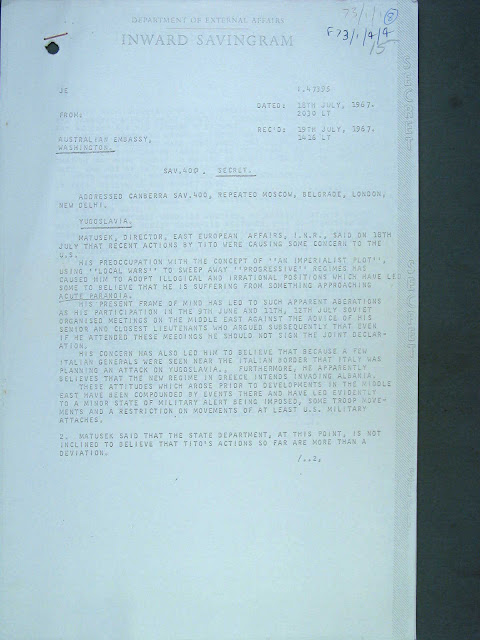 According to the cable: “…some recent actions by Tito were causing concern to the US…His preoccupation with the concept of an imperialist plot…caused him to adopt illogical and irrational positions.’